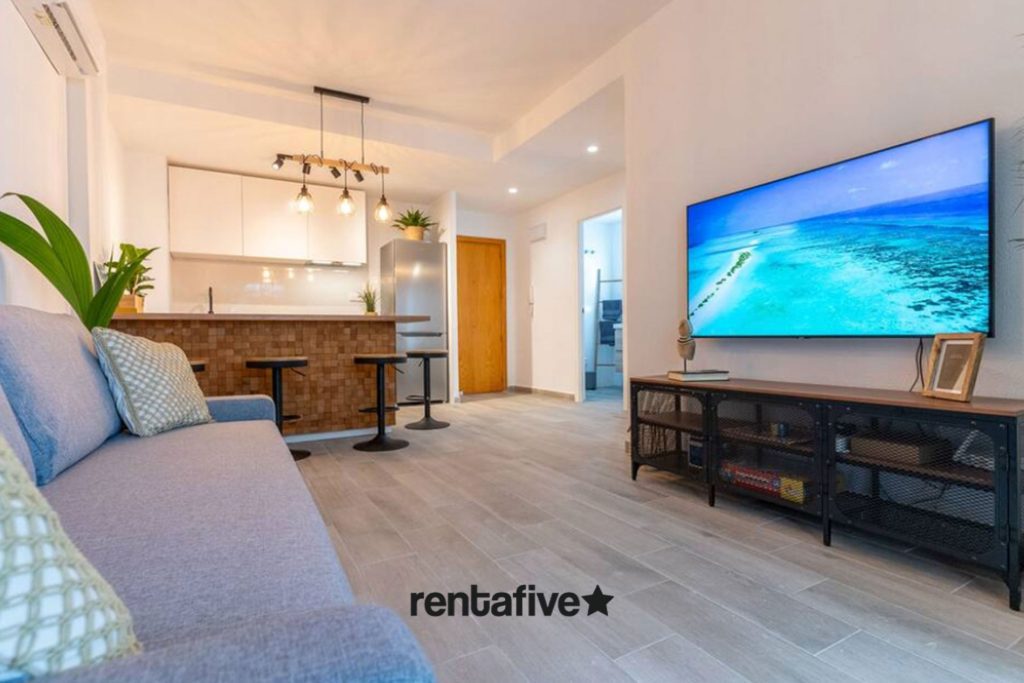 1 min andando de la playa. 100% reformado integral. Aire Acondicionado. Gran Terraza con vistas al mar, ascensor, todos los electrodomésticos nuevos, todos los muebles nuevos. Wifi Gratis 480MB, TV Samsung 55″ (Smart TV, Netflix, Youtube, etc.), cocina americana con isla, habitación de matrimonio cama 1,50 con salida a la terraza. ¡Unas vacaciones perfectas!